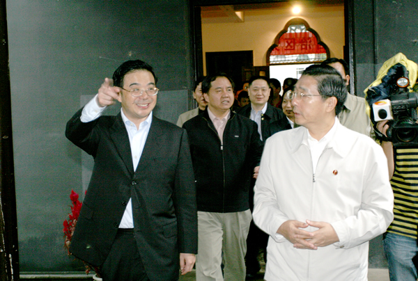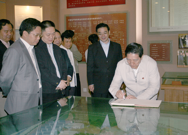 代表团一行在城南书院校区参观了青年毛泽东纪念馆,讲解员向来访领导详细介绍了毛泽东同志青年时期的革命经历和学习生活情况。在毛泽东同志当年参加集会的大礼堂、上课的教室、住过的寝室、进行冷水浴的水井、任主事的一附小,来访领导们久久驻足,追忆革命前辈那激情飞扬的岁月。郭声琨同志充分肯定了我校近几年的发展与成就,最后,饶有兴趣地在我校纪念册上签名留念。