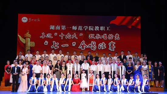6月30日晚,我校“喜迎十九大·欢歌献给党”庆七一教职工合唱比赛在音乐剧场隆重举行。省总工会党组书记徐文龙、省教育工会主席高新明莅临指导,我校全体校领导出席并参加演出。湖南省教育工会女工委主任孙晓红、湖南大学工会副主席张志军、湖南师范大学工会副主席梁蓓蓓、我校音乐舞蹈学院院长李小君、党总支书记谭顺来担任比赛评委。