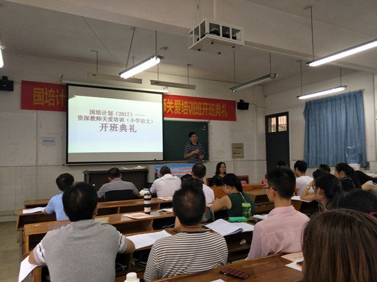 9月9日上午,国培计划(2017)——乡村教师访名校教学点村小资深教师关爱培训小学语文班在我校开班。文学与新闻传播学院院长佘向军、副院长龙永干、副院长邓姿、班主任袁利芬、语文学科专家周杨林等出席开班典礼。