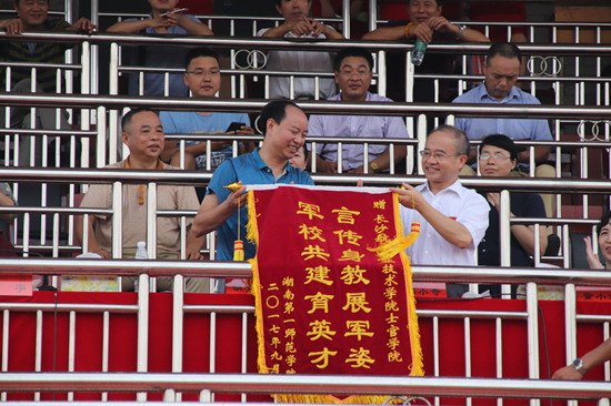副校长曹兴宣读了新生军训标兵、内务评比优秀寝室、军歌演唱优秀方阵和分列式优秀方阵名单,全体领导向受到表彰的集体和个人颁发了锦旗和获奖证书。党委书记彭小奇教授代表学校向承训单位长沙航空职业技术学院赠送了锦旗。
