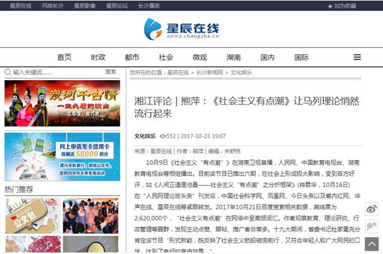 在《星辰在线》湘江评论版块,熊萍教授发表了《“社会主义有点潮”让马列理论悄然流行起来》一文。文章分析指出”社会主义有点潮”被网友“热捧”的主要原因是它巧妙结合了“大宣传”与“小传播”,内容“刚”与形式“柔,阳春白雪“雅”与下里巴人“俗”。文章称,“该节目在十九大前夕播出,为十九大的胜利召开营造了浓厚的理论氛围、舆论氛围、文化氛围,强化了坚持走中国特色社会主义道路的自信,值得同行借鉴。”