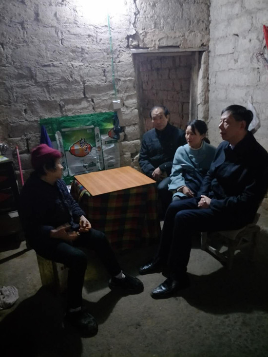 副校长江正云率教务处处长李茂平、文学与新闻传播学院党总支书记刘澍心、副院长邓姿慰问了结对帮扶建卡贫困户左银球。左银球患眼疾,老伴因病去世,儿子患先天性心脏病,家庭因病致贫。江正云跟他们坐在一起进行面对面交谈,询问左银球及其儿子的身体状况,送上扶贫慰问金,鼓励他们积极面对困难,改善现在家庭状况。