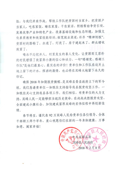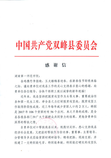 为贯彻落实中央和省委扶贫开发工作系列会议精神,实施精准扶贫,加快贫困群众脱贫致富步伐,我校与双峰县荷叶镇白泥村结对帮扶,并选派了两名优秀干部驻村开展扶贫工作。经过三年来的共同努力,我校的扶贫工作得到了当地领导、群众的一致认可,白泥村顺利实现脱贫摘帽。为此,双峰县委、县政府为我校送来了感谢信,对我校为双峰县做好精准扶贫工作所给予的支持帮助和做出的成绩表示感谢。