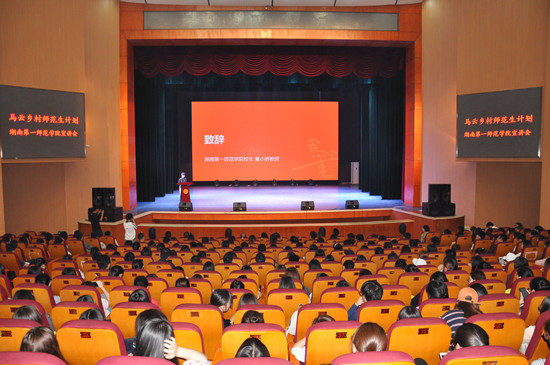 4月3日下午,马云乡村师范生计划宣讲会在我校田汉剧场成功举行。出席宣讲会的有校党委书记彭小奇、校长童小娇、马云公益基金会执行秘书长于秀红、潇湘晨报总编辑伍洪涛、湖南卫视主持人杨乐乐、马云乡村校长计划入选校长黄丽君、马云乡村教师奖获奖教师王菲、我校优秀校友代表向立华以及我校2018年应届毕业生代表。