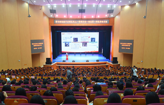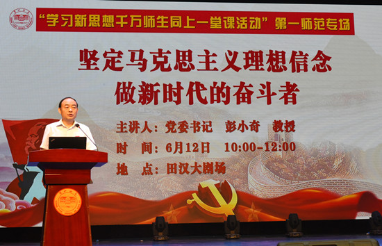 6月12日上午10时,“学习新思想千万师生同上一堂课活动”第一师范专场在我校田汉剧场举行。校党委书记彭小奇教授以“坚定马克思主义理想信念,做新时代的奋斗者”为题进行了授课。活动由副校长刘鸿翔教授主持。校领导、学工系统人员(含党总支书记、副书记)、除值班人员外的行政部门人员、没有课的教学院部人员、学生代表等共1000余人在现场听课。