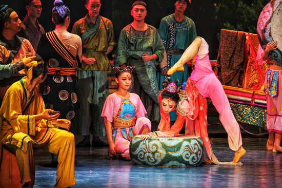 中国经典舞剧《丝路花雨》被称为“二十世纪华人舞蹈经典作品”“中国舞剧史上里程碑”“中国舞剧之最”“中国民族舞剧的典范”“东方的《天鹅湖》”。舞剧以盛唐丝绸之路为时代背景,以雄伟深邃的莫高窟和无与伦比、美轮美奂的敦煌壁画为素材,不着一字,尽得风流,把一个反弹琵琶的佛国故事演绎成人间的悲欢离合。舞剧博采各地民间歌舞之长,歌颂了画工神笔张和歌伎英娘的光辉艺术形象,描述了他们的悲欢离合以及与波斯商人伊努斯之间的纯洁友谊,颂扬了中国和西域人民源远流长的交往历史,再现了唐朝经济、文化与对外交往的繁荣盛况。整场舞剧凸显敦煌舞蹈“灵魂”,融入印度、波斯等异域风情,将逼真的舞台布景、精美的服饰道具、动听的音乐和曼妙的舞姿融为一体,画面唯美,声情震撼,极富艺术感染力,为现场观众奉上了一顿高水准、高规格的艺术饕餮盛宴。