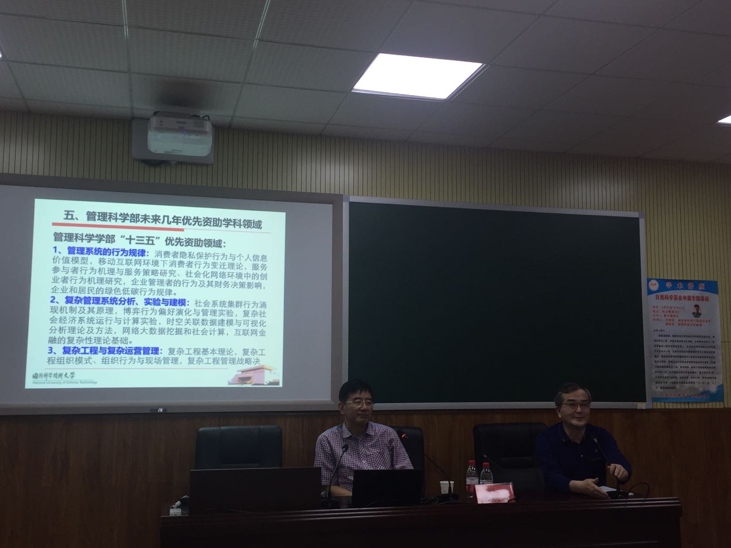 谭跃进教授的报告题为“怎么申请国自科学基金项目——以管理和信息学科为例”,报告内容主要分为三个部分:第一部分介绍了国自科学基金项目的评审要求和发展趋势,重点分析了“探索、前沿、需求、交叉”四个方面的内容。第二部分从数据上分析了2015~2018年国自申请和立项情况,着重强调了大数据在管理科学领域的发展与应用。第三部分结合具体申请案例,详细分析了国家自科基金申请中的常见问题和应注意的事项。在提问环节中,谭跃进教授与参加讲座的教师们就申报注意事项等问题进行了深入交流。
