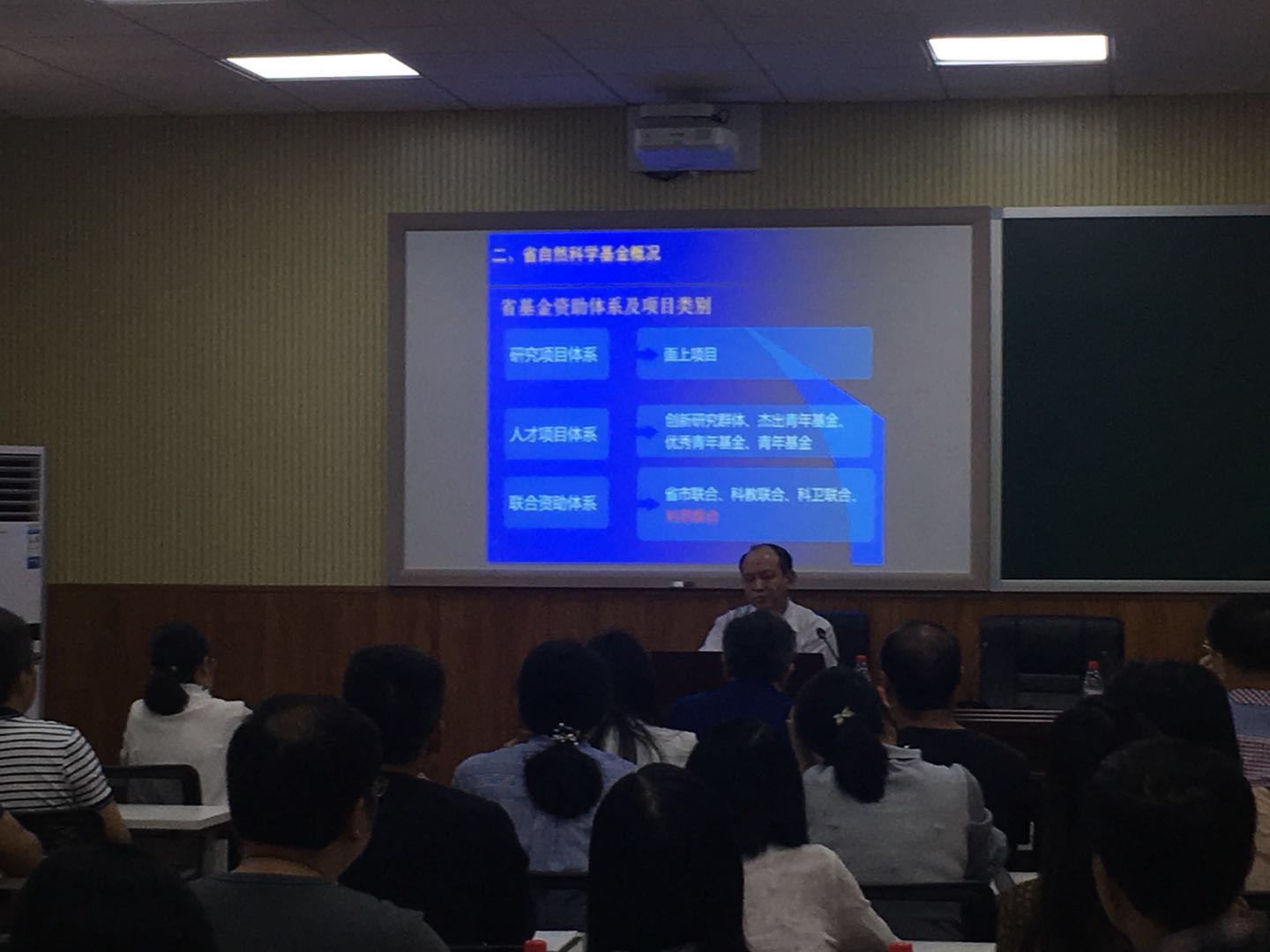 任主任作了题为“湖南省自然科学基金项目申报管理”的报告,首先介绍了国家自然科学基金的概况,及其在我省的申报与资助情况,其次重点介绍了湖南省自科基金项目资助体系、项目管理流程、项目评审立项流程、2019年度湖南省自然科学基金的立项情况等,对申请者基本条件和限项规定等新政策进行了重点解读。