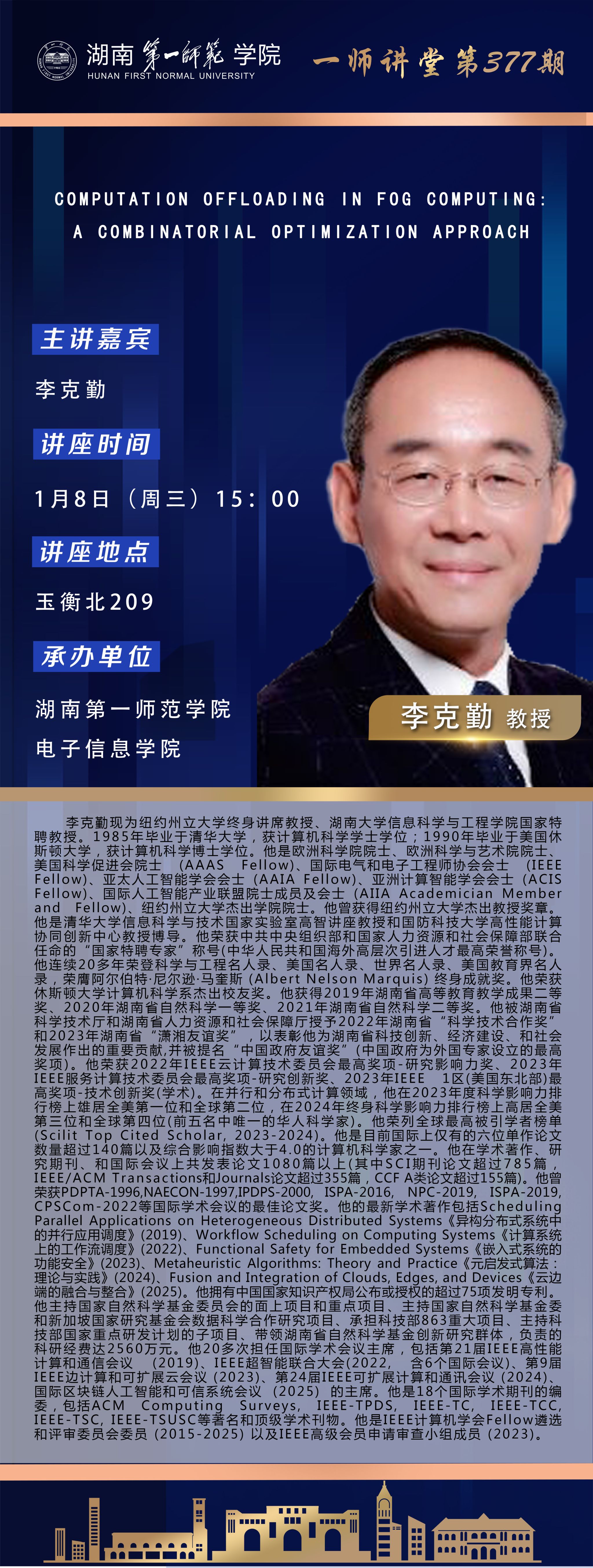 学术预告|一师讲堂第377期:COMPUTATION OFFLOADING IN FOG COMPUTING: A COMBINATORIAL OPTIMIZATION APPROACH