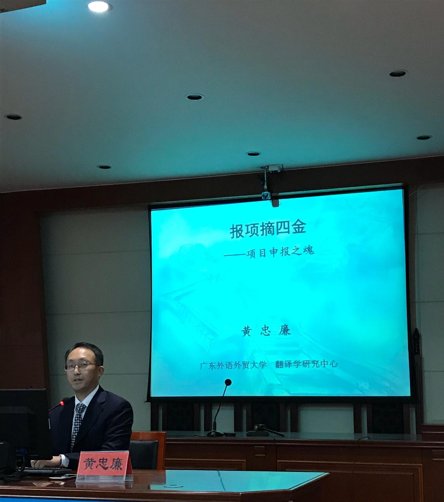 10月18日上午,应我校外国语学院“乐之论坛”邀请,黄忠廉教授来我校进行了一场“报项摘四金——项目申报之魂”的学术讲座。该讲座由外国语学院副院长康响英教授主持,我校2018年有意申报国家级项目的教师及部分青年教师参加了讲座。