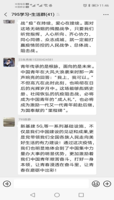 在各学院的积极动员下,各团支部以观看直播、群内文字讨论的形式开展了团课活动。本次线上团课分为两个部分:“聆听战役故事,齐展青春光芒”和“中国5G,新基建,新速度”。通过专家和抗疫工作人员的故事分享和激情演讲,团员青年们体会到了抗疫工作背后的艰辛与磨难;5G技术的开发与应用,让青年们意识到中国走在了“新革命”的第一线。本次团课直播结束后,一些团支部还采用了知识竞答、交流观看心得等方式进行了交流学习,医务工作者们的抗疫分享与演讲,让团员青年们深受鼓舞,并纷纷表示要积极学习战役中各位青年英雄表现出来的大无畏的奉献精神。