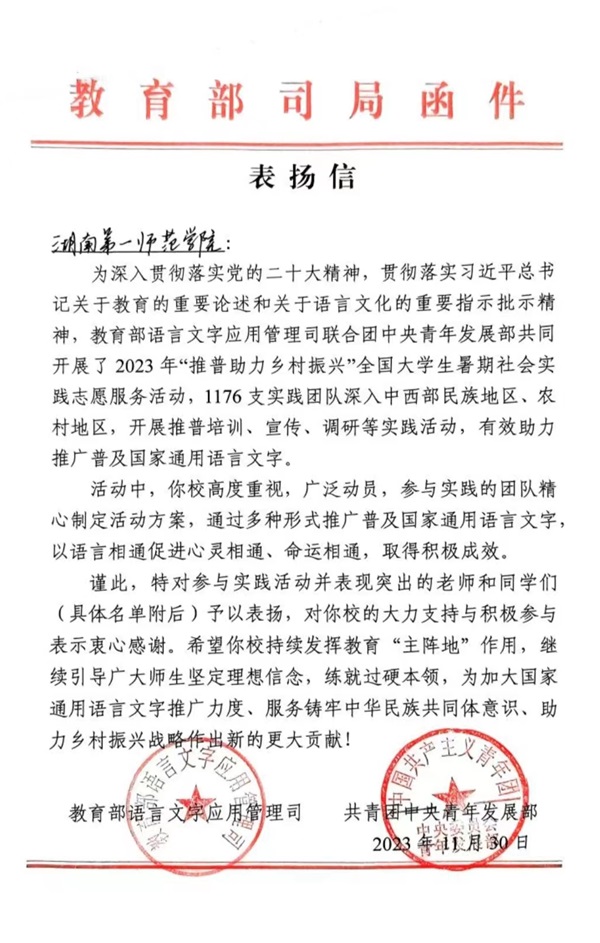 近日,教育部语言文字应用管理司、共青团中央青年发展部共同主办的2023年“推普助力乡村振兴”全国大学生暑期社会实践志愿服务活动评优结果揭晓。我校文学与新闻传播学院赴永州市蓝山县“推普”团队在全国1176支实践团队中脱颖而出,荣获“优秀团队”称号(湖南省仅五支队伍)并获教育部语言文字应用司和共青团中央青年发展部来信表扬。