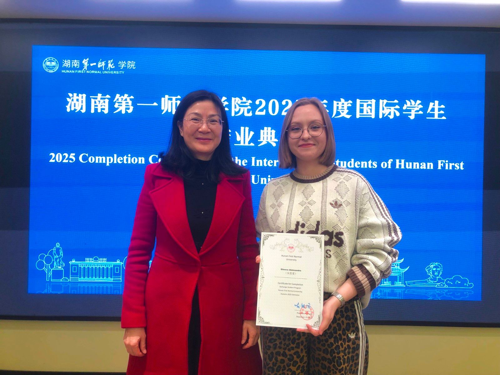 12月15日下午,我校2025年度国际学生结业典礼在百熙楼701会议室举行。来自“一带一路”沿线国家的语言生奖学金生及秋季交流项目交换生顺利完成学业,在湘学习生涯圆满落幕。校党委委员、副校长蒋蓉出席典礼并致辞,国际交流与港澳台事务处全体人员、国际学生授课教师代表现场参会;合作院校俄罗斯乌里扬诺夫斯克国立师范大学英语系主任Irina Zorina、国际交流处负责人Tatiana通过线上视频方式参会并致辞。